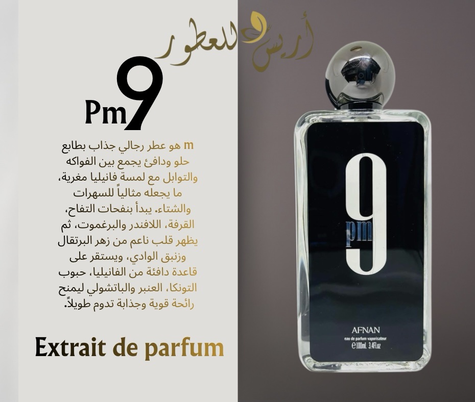 عطر 9PM هو عطر رجالي يتميز برائحة دافئة وحلوة جذابة تعطي حضورًا قويًا خاصة في السهرات، حيث يجمع في مقدمته بين التفاح والقرفة مع لمسة من البرغموت، ثم قلب من زهرة البرتقال، ويستقر على قاعدة غنية من الفانيليا وحبوب التونكا والعنبر والباتشولي التي تمنحه عمقًا وثباتًا مميزًا يجعله من العطور الشبابية القوية.