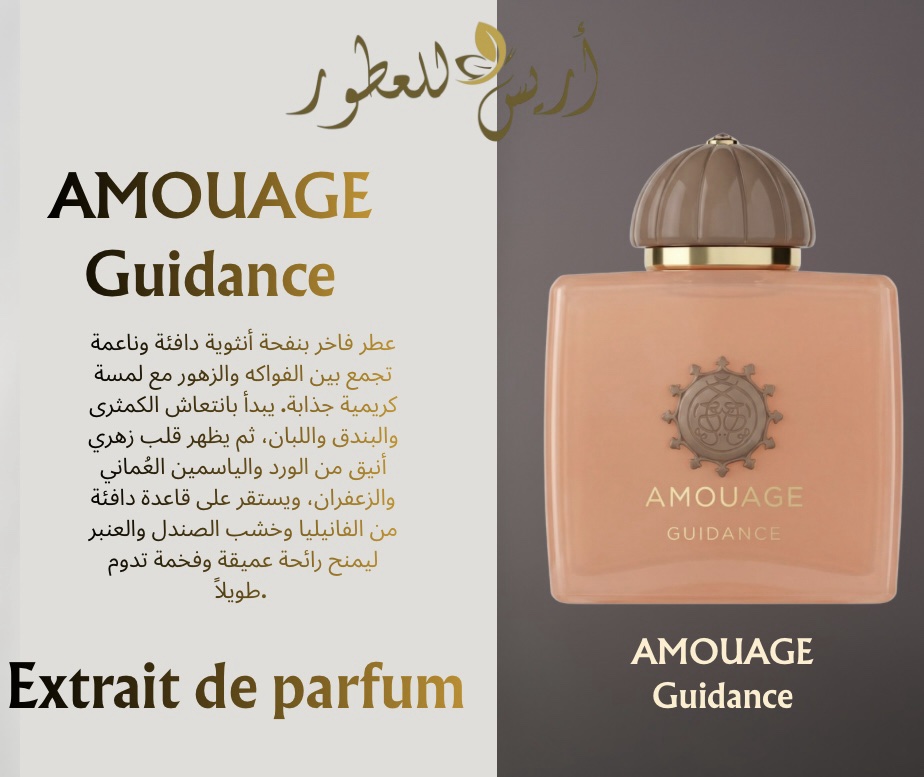 عطر Amouage Guidance هو عطر يونيسكس (للرجال والنساء) يميل قليلاً للجانب النسائي، يتميز برائحة فاخرة تجمع بين النعومة والدفء، حيث يفتتح بنفحات الكمثرى والبخور والبندق، ثم قلب زهري غني من الورد والياسمين سامباك والزعفران والأوسمانثوس، بينما تستقر القاعدة على مزيج دافئ من خشب الصندل والعنبر الرمادي والفانيليا والأكيجالا وود واللادن، ليعطي عطراً عميقاً وكريميّاً يدوم طويلاً ويعكس فخامة العطور النيش. ✨
