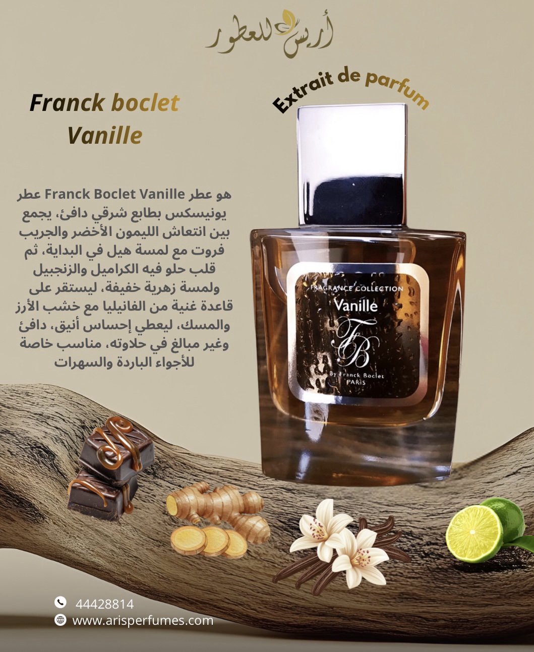 عطر Franck Boclet Vanille هو عطر يونيسكس بطابع شرقي دافئ، يجمع بين انتعاش الليمون الأخضر والجريب فروت مع لمسة هيل في البداية، ثم قلب حلو فيه الكراميل والزنجبيل ولمسة زهرية خفيفة، ليستقر على قاعدة غنية من الفانيليا مع خشب الأرز والمسك، ليعطي إحساس أنيق، دافئ وغير مبالغ في حلاوته، مناسب خاصة للأجواء الباردة والسهرات